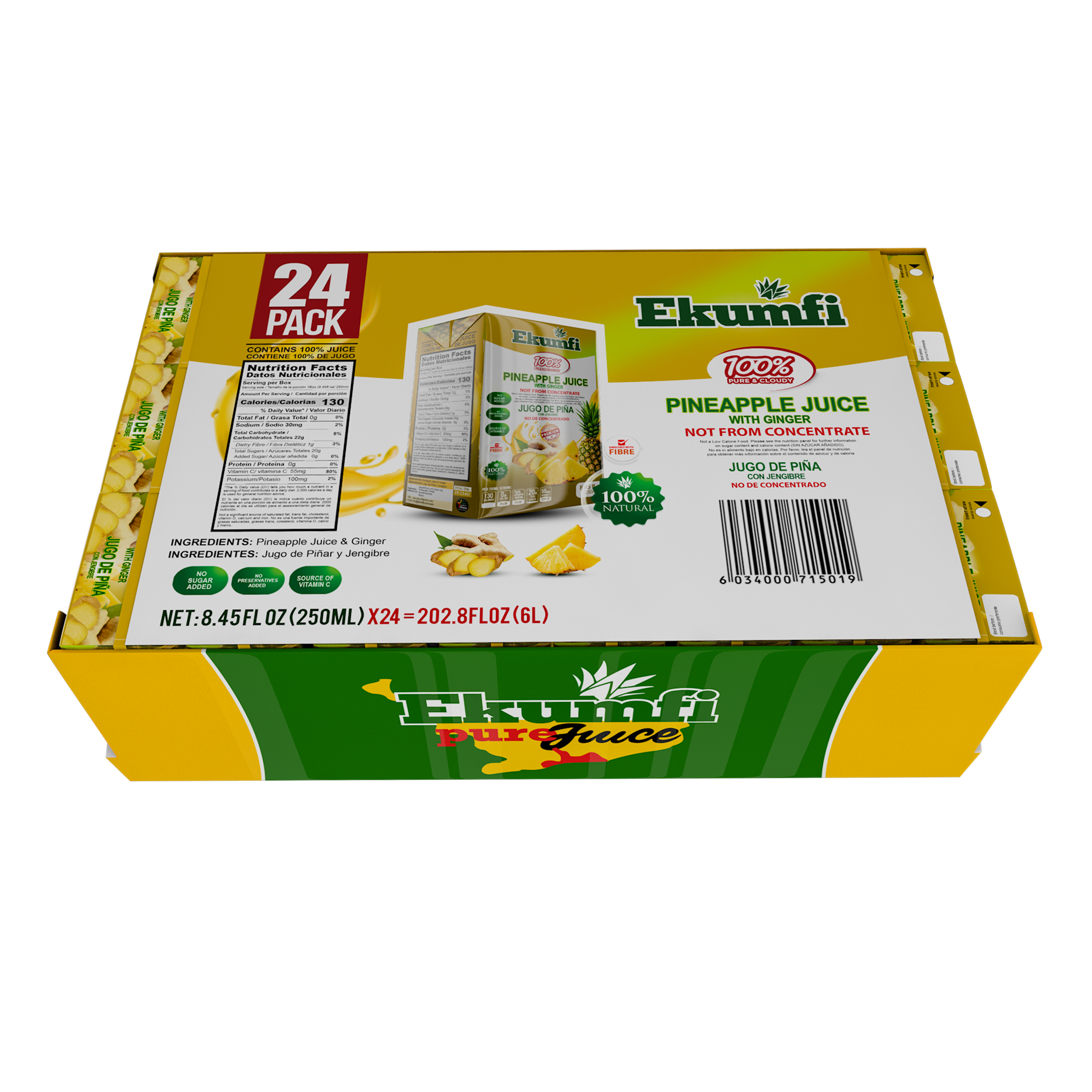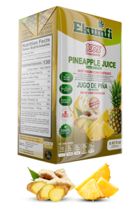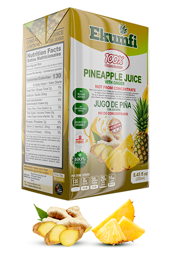 Ekumfi Pure Pineapple Juice with Ginger is your 100% all NATURAL PASTEURIZED PINEAPPLE JUICE WITH GINGER MADE FROM NON-GMO FRUITS, NO ADDITIVES, NO PRESERVATIVES, NO ADDED SUGAR, NO ARTIFICIAL SWEETENERS, NO FLAVORING OR COLORING.
