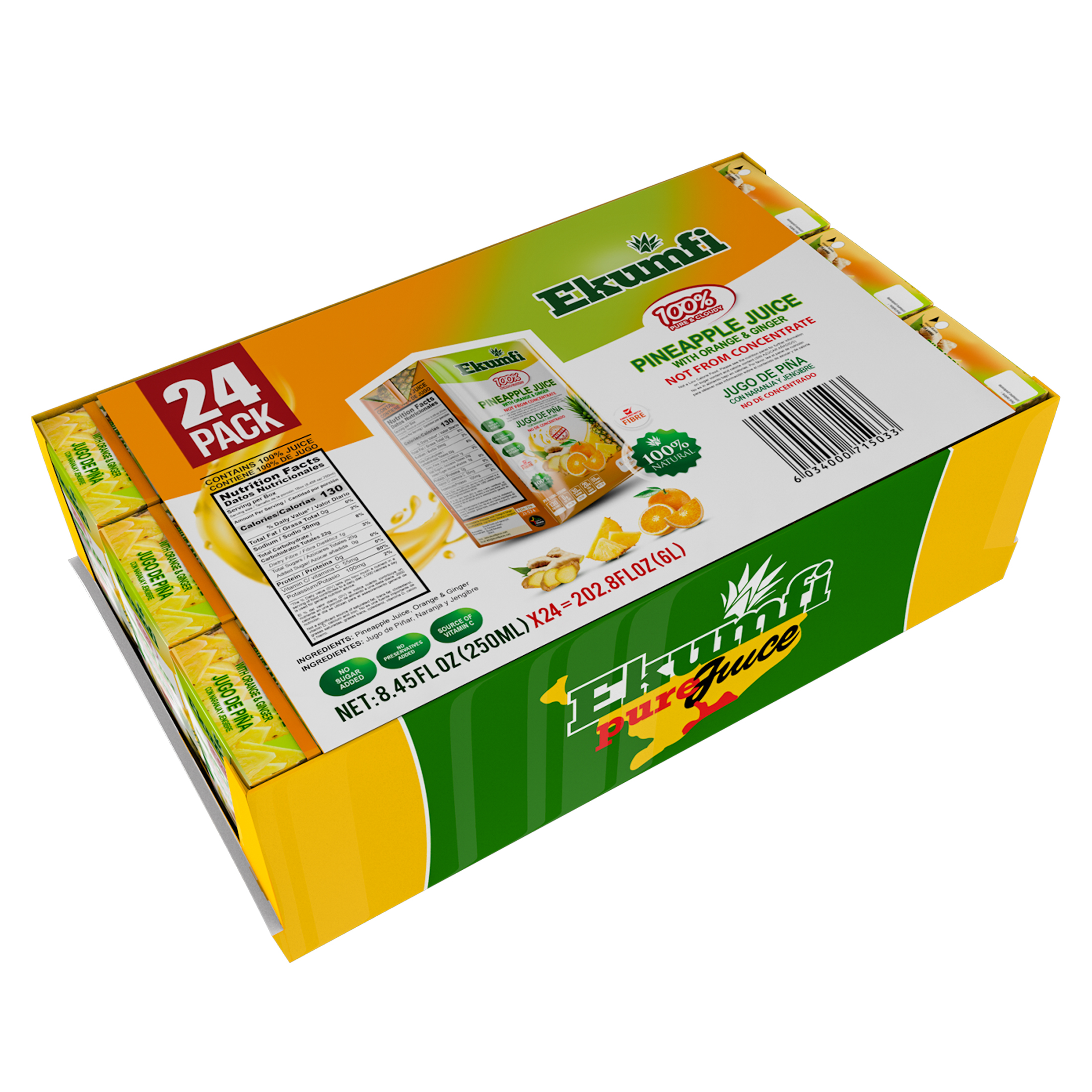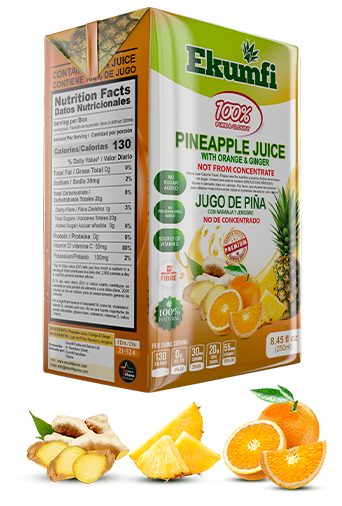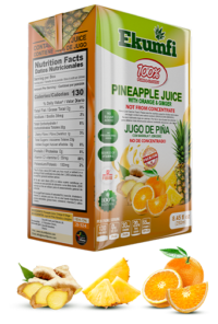 Ekumfi Pure Pineapple Juice with Orange and Ginger is your 100% all NATURAL PASTEURIZED PINEAPPLE JUICE WITH ORANGE AND GINGER MADE FROM NON-GMO FRUITS, NO ADDITIVES, NO PRESERVATIVES, NO ADDED SUGAR, NO ARTIFICIAL SWEETENERS NO FLAVORING OR COLORING.