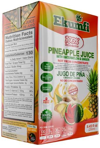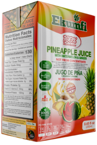 Ekumfi Pure Pineapple Juice with Watermelon and Ginger is your 100% all NATURAL PASTEURIZED PINEAPPLE JUICE WITH WATERMELON AND GINGER MADE FROM NON-GMO FRUITS, NO ADDITIVES, NO PRESERVATIVES, NO ADDED SUGAR, NO ARTIFICIAL SWEETENERS, NO FLAVORING OR COLORING.