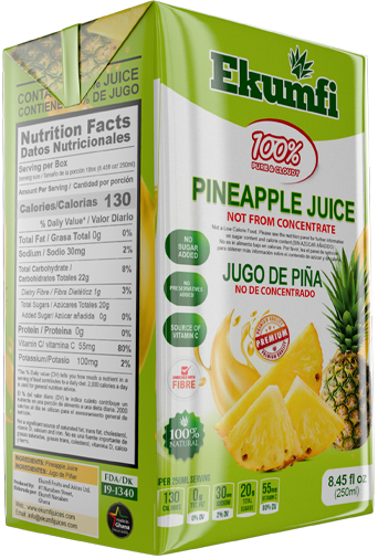 Ekumfi Pure Pineapple Juice is your 100% all NATURAL PASTEURIZED PINEAPPLE JUICE MADE FROM NON-GMO FRUITS, NO ADDITIVES, NO PRESERVATIVES, NO ADDED SUGAR, NO ARTIFICIAL SWEETENERS, NO FLAVORING OR COLORING.
